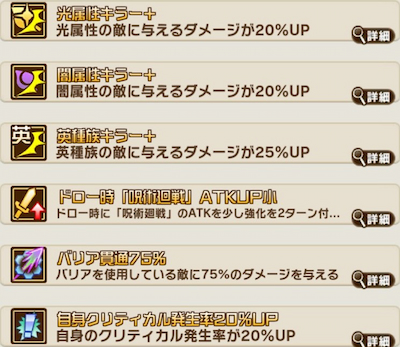 | ①このターン攻撃する味方のクリティカル発生率を少し上昇+このターン攻撃する英種族のクリティカル発生率を上昇+このターン攻撃する「呪術廻戦」のクリティカル発生率を少し上昇+敵単体に爆絶強力な全属性有利となる冥属性の2回攻撃+HPを超大きく回復 ②12コンボ以上の場合、追加でこのターン攻撃する自身のクリティカル発生率を少し上昇+敵単体に超強力な冥属性攻撃 ③15コンボ以上の場合、追加でこのターン攻撃する自身のクリティカル発生率を上昇+敵単体に超絶強力な冥属性攻撃 |